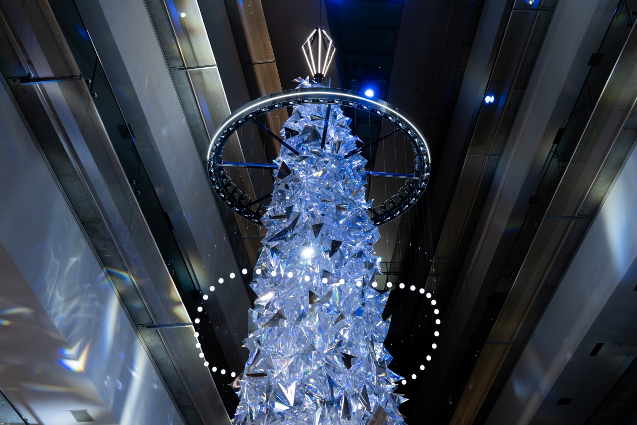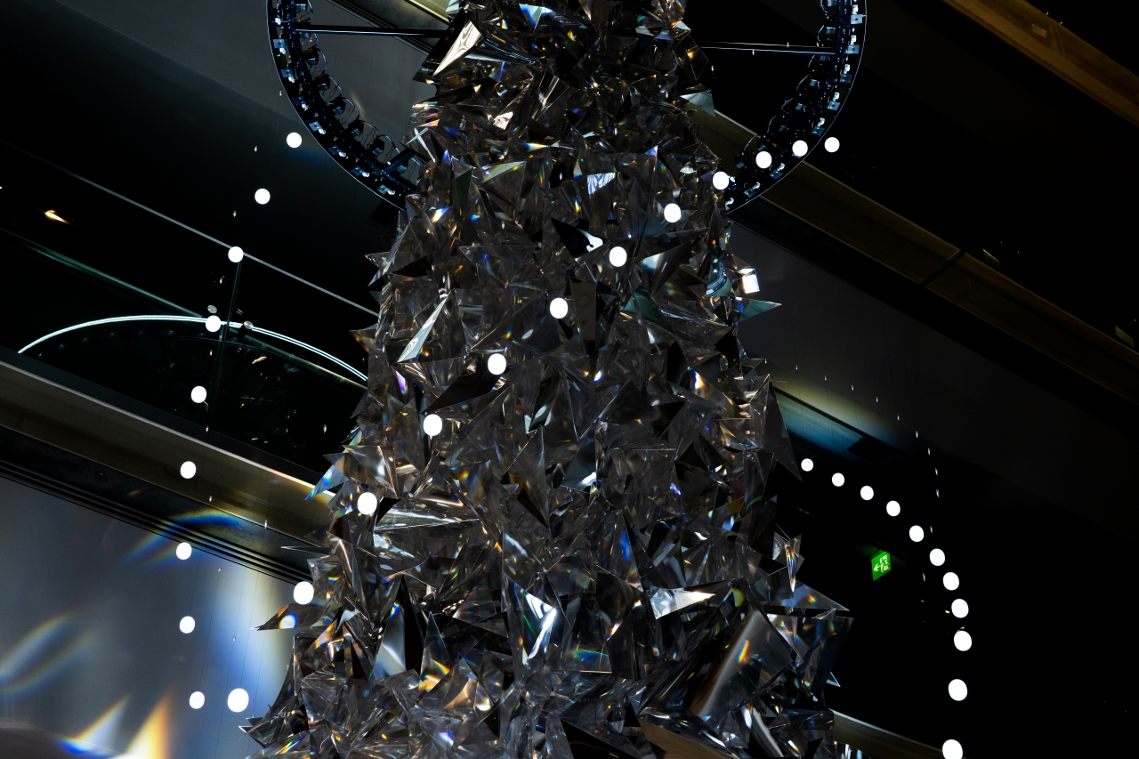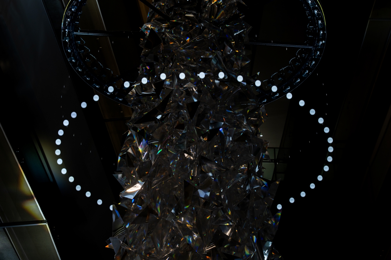 約1,000個のエレメントで構成された「多様性」を意味する多面体プリズムに、「普遍性」を象徴する光のリングが軽やかに舞う。