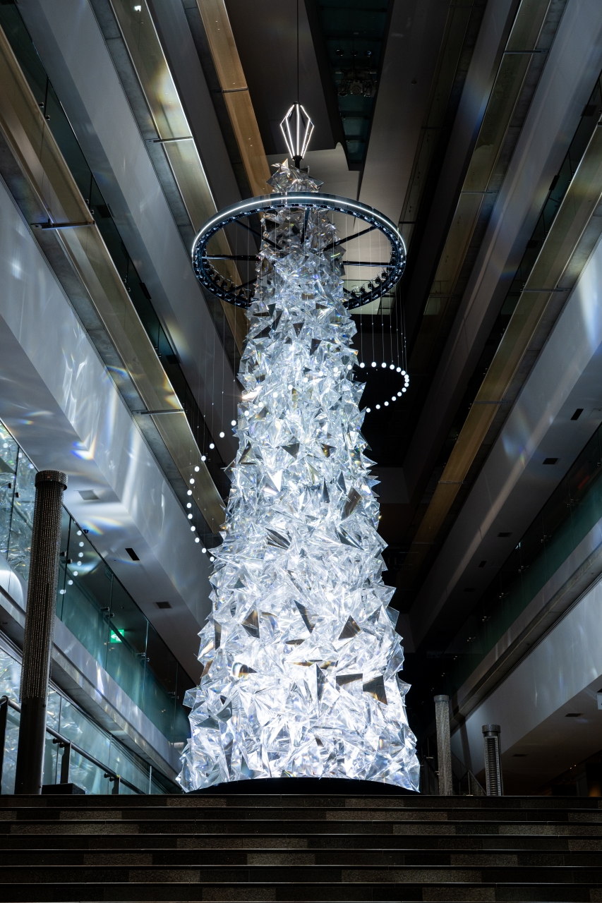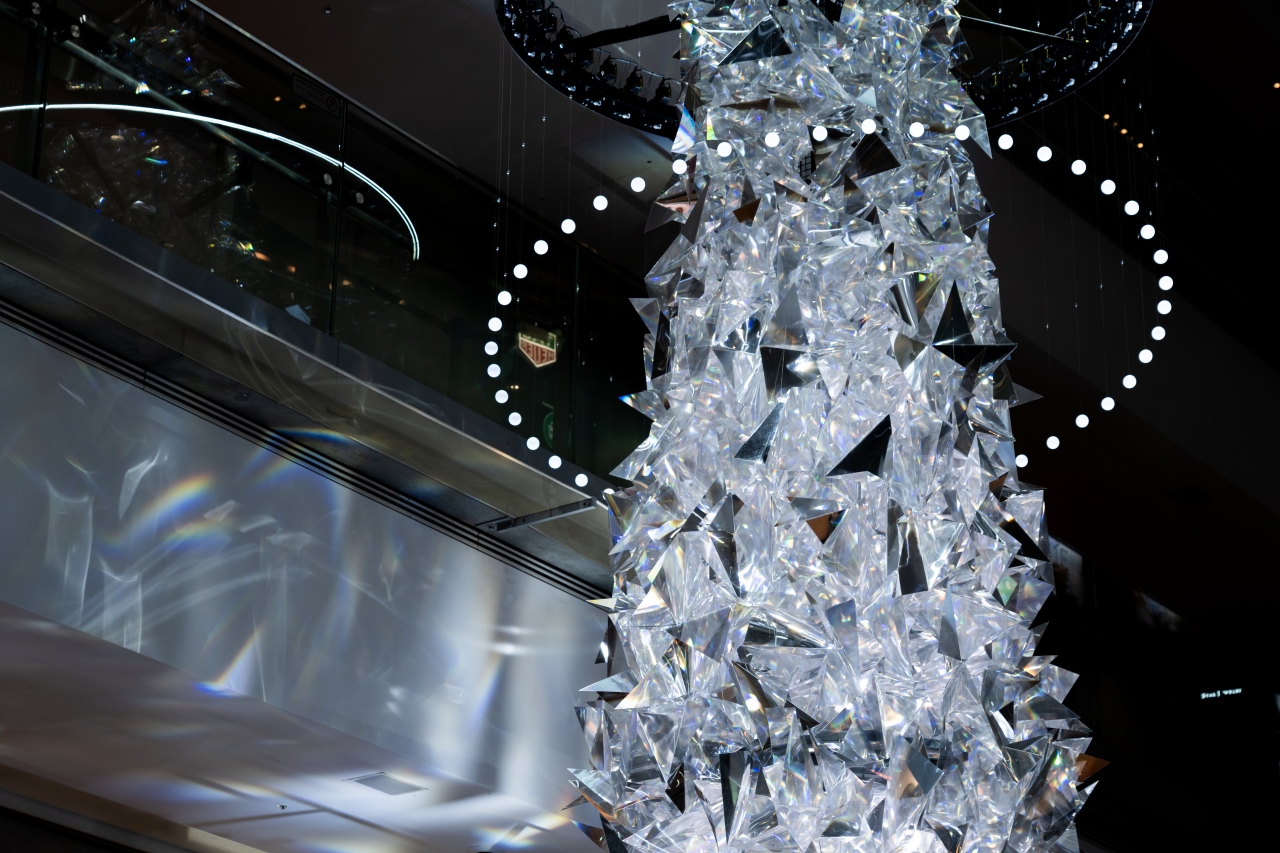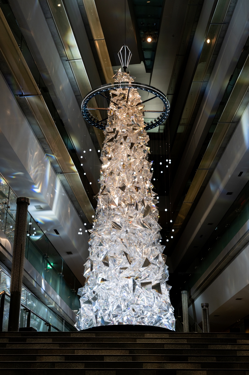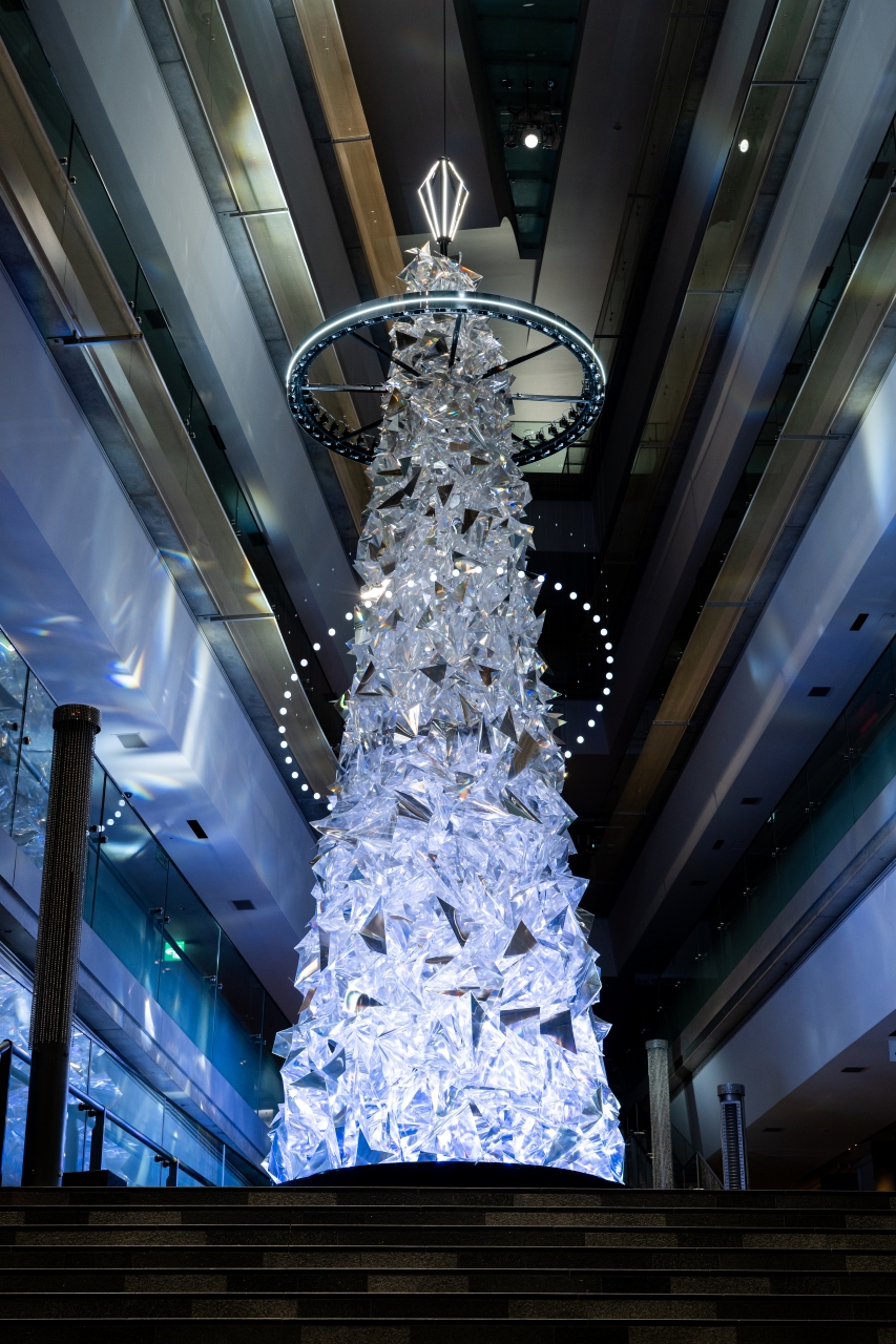 約1,000個のエレメントで構成された「多様性」を意味する多面体プリズムに、「普遍性」を象徴する光のリングが軽やかに舞う。